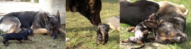 Postupně jsme ji seznámili i se všemi našimi zvířátky. Doma máme ještě kočičku Peggy, která se ji nejdříve trošku bála, ale teď už spolu občas spí na gauči a Kirbi ji trpělivě nechává jíst ze své misky – když ta kočička tak pěkně papá, tak ji přece nebude rušit. Venku je ještě teta Daisy (ovčanda), která naštěstí všechna zvířátka miluje a nikdy by ji neublížila (když na některých fotkách to vypadá jinak J). Holky spolu dovádějí venku, okusují se, štěkotem odrazují vetřelce od plotu nebo se prostě jen válí na sluníčku.