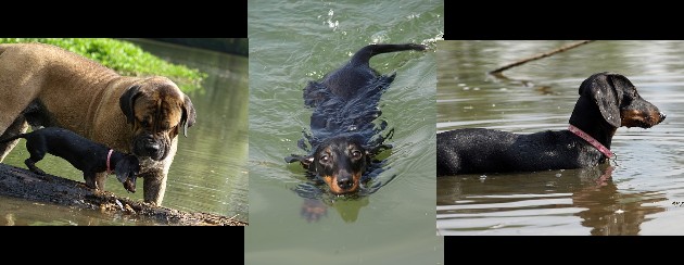 Vzhledem k tomu, že naši kluci nadevše milují vodu, bylo také potřeba naučit Kirbi plavat. Šli jsme na to velmi pomalu, Garpík vydatně předváděl ukázky a jednoho dne se Kirbi rozhodla, že přece jenom bude muset jít kluky zachránit a připlavala k nám. Má sice dost zvláštní systém plavání – co nejvíce vykulit oči a pro jistotu kormidlovat ocasem, ale ve vodě je ráda a překvapivě dokáže uplavat velké vzdálenosti a je dost vytrvalá. Zvlášť když je na břehu Angii, tak to radši plave k někomu na záda, než by do sebe nechala pořád rýt tím jejím „rypáčkem“.
